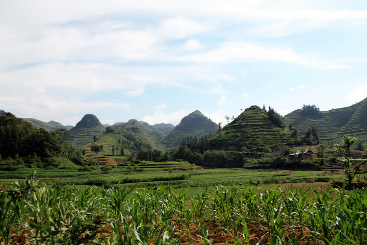 Après un encas sur un stand, nous partons découvrir ce que les montagnes ont à nous offrir. Faute de chemin indiqué, nous suivons un groupe de travailleurs des champs jusqu'à des petits sentiers qui longent les habitations en boue et bois H'Mongs fleurs (ethnie nomade des montagnes du sud de la Chine, nord du Vietnam et Laos).