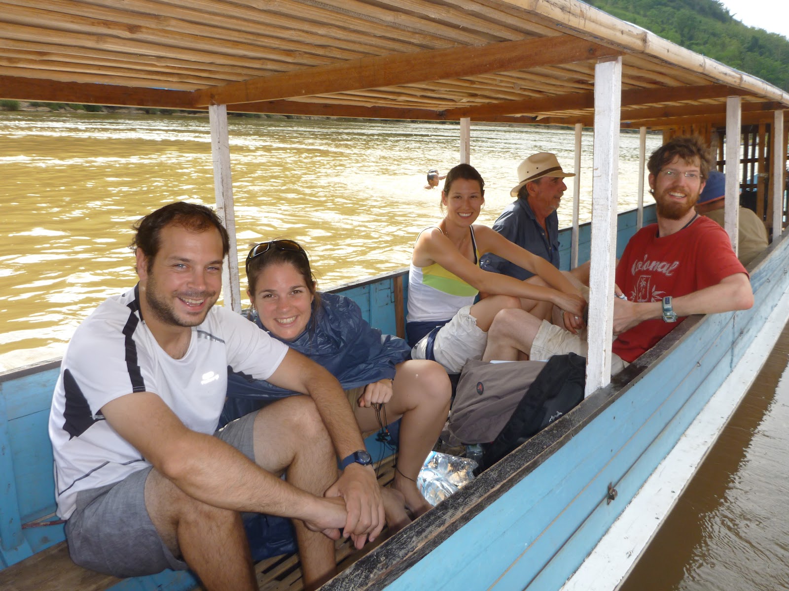 Au cours du trajet en bus, nous réalisons que le couple de suisses souhaite se rendre à la même destination que nous : Nuang Khiaw. Pour cela, il faut prendre un bateau et redescendre la rivière. L'idée d'un trajet sur l'eau plait bien aux australiens qui n'ont pas de programme définit. Notre routarde suisse, quant à elle, n'est pas très motivée à l'idée de passer une nuit dans ce village pour attendre le bus du lendemain. Nous sommes donc suffisamment nombreux pour partager les frais du transport en bateau et embarquons dans une grosse pirogue à moteur.