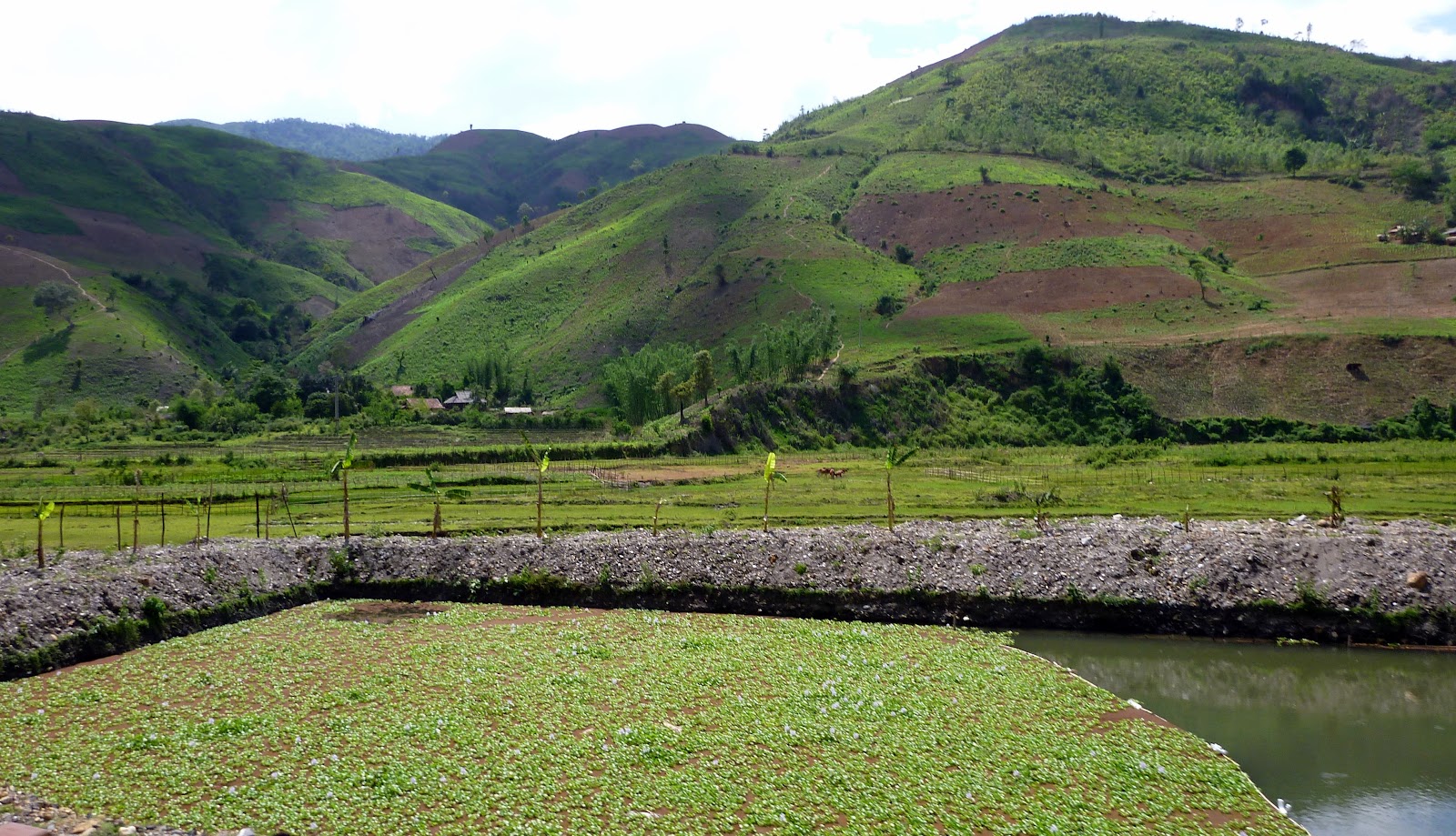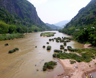 Au moment de reprendre la route, nous sommes rejoints par deux australiens qui sont arrivés à la frontière en taxi. Nous reprenons donc cette magnifique route montagneuse, le bus traversera plusieurs rivières directement sans pouvoir utiliser les ponts en cours de construction. Au fur et à mesure des villages que nous traversons le bus se remplit d'occupants et de marchandises : une cage en bambou remplie de poules est fixée sur le toit. Finalement nous arriverons vers midi à Muang Khua, gros village dotée d'un petit port sur la rivière Nam Ou qui est d'ailleurs son seul attrait. Il nous aura donc fallu 6 heures pour parcourir les 100 kilomètres de montagne, soit une moyenne de 17 Km/h, nous avons donc déjà adopté le fameux rythme laotien ;)