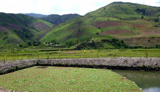 5h30, nous prenons le mini bus quotidien qui relie le Vietnam au Laos en traversant la frontière la plus au nord. 30 minutes plus tard, première escale dans un village voisin, un vietnamien monte et se présente à nous comme un douanier. Il nous explique qu'il peut nous rendre service en échangeant nos Dongs vietnamiens en Kips laotiens. Nous n'avons pas d'autre choix que de participer à ce marché noir. En effet, nous n'avons ni dollar ni kip en poche, il était impossible d'en obtenir dans une banque vietnamienne, or ce sont les seules monnaies acceptées au poste frontière... Bref, nous changeons l'équivalent de 100€ et nous perdons 12€ dans l'affaire, il fait bon être douanier dans cette région... Nous nous réconfortons en nous disant que nous avons bien fait de refuser l'offre de notre hôtel de la veille qui nous aurait coûtée 100 000 dongs (4€ de plus). Ces transactions seront l'occasion de faire connaissance avec les autres touristes du bus, un couple de suisses et une routarde solitaire de la même nationalité.
